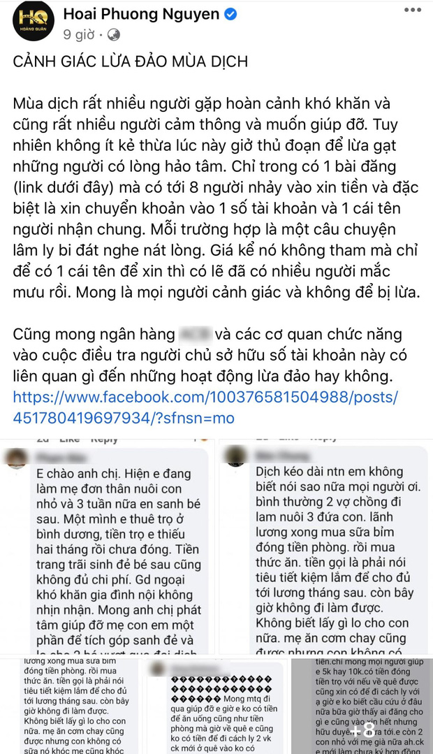 Đây là chiêu thức quen thuộc mà những kẻ xấu thường xuyên sử dụng để lừa gạt mọi người. Trong mùa dịch, người dân hầu hết đều gặp không ít khó khăn, do đó việc làm này đặc biệt rất đáng lên án. Chia sẻ của ông xã Việt Hương cũng là lời cảnh tỉnh cho nhiều người. Đồng thời, Hoài Phương cũng hy vọng phía cơ quan chức năng vào cuộc, điều tra về người chủ sở hữu số tài khoản này có liên quan tới hoạt động lừa đảo hay không.