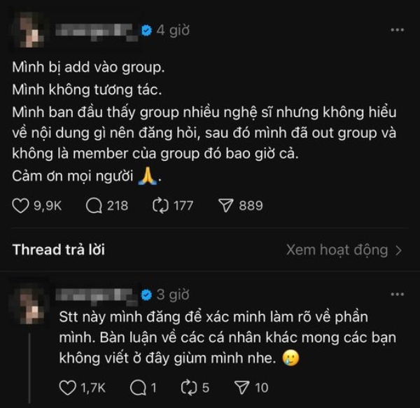 "Mình bị add vào group. Mình không tương tác. Mình ban đầu thấy group nhiều nghệ sĩ nhưng không hiểu về nội dung gì nên đăng hỏi, sau đó mình đã out group và không là member của group đó bao giờ cả. Cảm ơn mọi người", Orange chia sẻ.
