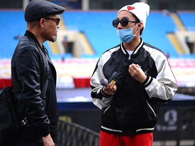 Giọng ca "Lạc trôi" đeo khẩu trang trò chuyện với quản lý cũ, nhạc sĩ Huy Tuấn trong buổi tổng duyệt một sự kiện âm nhạc lớn tại Hà Nội.