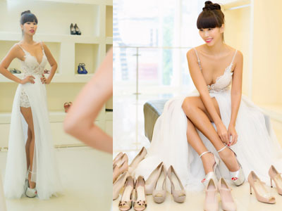 Hà Anh thử váy cưới khoét ngực, hở lưng