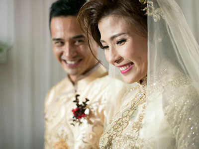 Cô dâu được 3-4 người trang điểm, làm tóc. Chú rể cười tít mắt khi ngắm bà xã xinh đẹp trong hôn lễ.