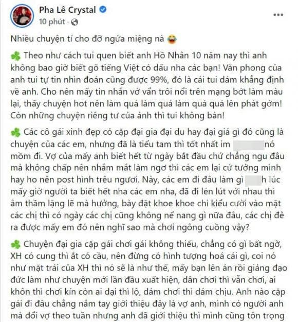 Cụ thể, Pha Lê tiết lộ: "Theo như cách tui quen biết anh Hồ Nhân 10 năm nay thì anh không bao giờ biết gõ tiếng Việt có dấu nha các bạn! Văn phong của anh tui tự tin nhìn đoán cũng được 99%, đó là cái tui dám khẳng định về anh. Cho nên mấy tin nhắn vớ vẩn trôi nổi trên mạng bớt làm màu lại, thấy chuyện hot nên làm quá làm quá làm quá quá lên phát gớm! Còn những chuyện riêng tư của ảnh thì tui không bàn".