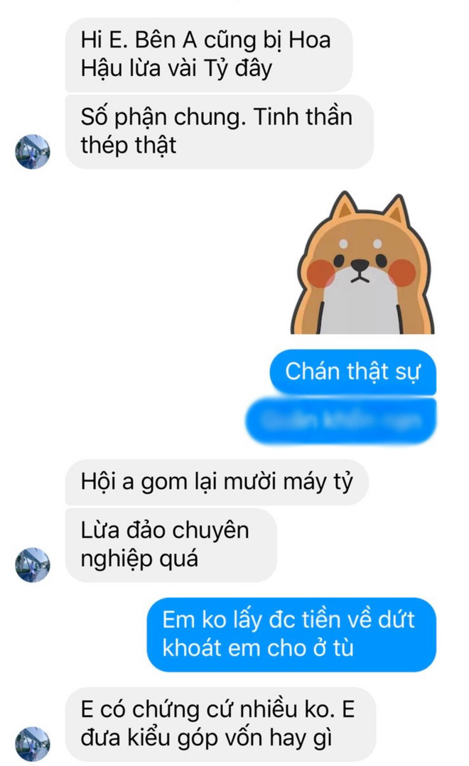 Cứ từ từ để đó chuyện còn rất rất dài... dù không lấy lại được tiền thì cũng phải cho ra ánh sáng. Ai giận mình cứ giận chứ để nó đi lừa người khác lấy tiền trả mình thì cũng không can tâm, nó đang doạ kiện ngược lại mình đây này... Hộ cái chị hoa hậu ơi, gì chứ người chị lừa ngập ngụa đây này, mỗi ngày chị trốn chui trốn lủi chi bằng chị vào tù hối lỗi lúc đó tôi mới hả dạ được còn để chị ở ngoài ngày nào là tôi còn chiến đấu ngày đó tới cùng nhé chị hoa hậu! **** *** nhất trên đời là đi lừa người mang ơn với mình, lí do tại sao ngày mai sẽ nói tiếp! Hôm nay tạm thế đã.