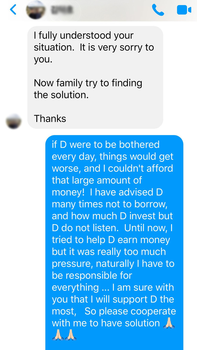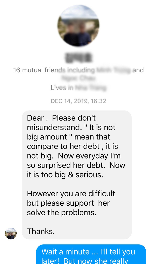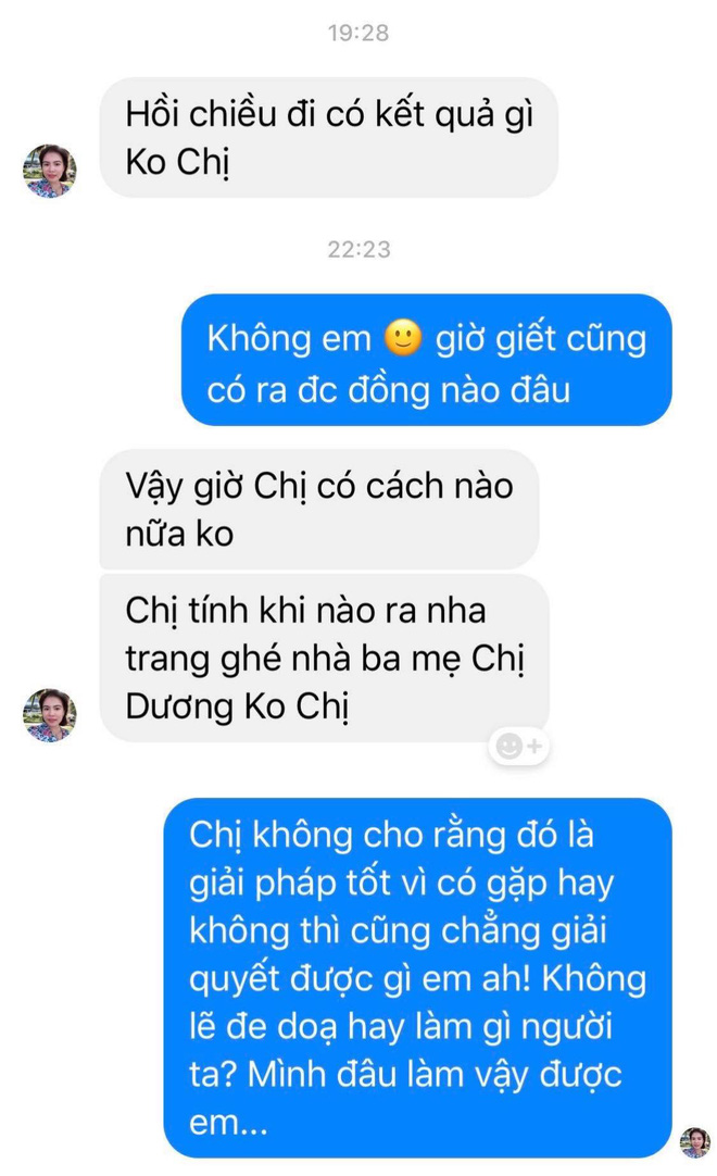 Ngày mình đến gặp chị và anh chồng doanh nhân giàu có, chính anh là người chủ động xin mình đừng làm ầm lên và hãy giúp chị qua cơn khó khăn này tuy nhiên lúc đó khi sự việc chưa bung bét nên mình cứ ngỡ chị nợ mỗi mình... Hoá ra lợi dụng sự thân thiết và lòng tin của mình mà chị tuồn tài sản đi đâu hết tới lượt mình thì đã quá muộn! Còn anh chồng tử tế là thế, đứng trước mặt mình đáng thương lắm luôn, khóc lóc kêu mỗi ngày đều bị gọi điện doạ giết vì vợ ngu nhưng xin hãy thương cô ấy vì cô ấy đẹp mà giờ anh về Hàn Quốc để vợ anh 1 mình gánh tất, theo anh nói là anh chẳng biết gì hết, cô ấy tự làm tự chịu, ôi vợ chồng yêu nhau ghê thương nhau quá...