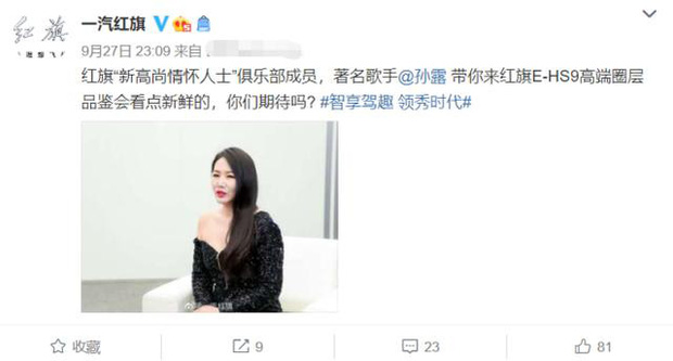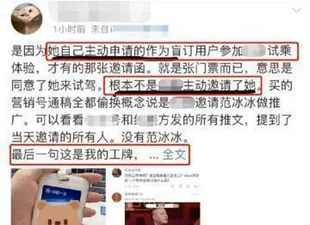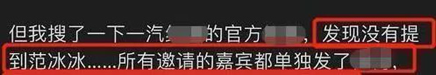 Trên Weibo, hãng xe vào ngày hôm đó chia sẻ rất nhiều hình ảnh các nghệ sĩ có hợp tác với thương hiệu đến trải nghiệm tính năng của xe, gồm nam diễn viên Cận Đông và ca sĩ Tôn Lộ, hoàn toàn không nhắc gì tới Phạm Băng Băng.