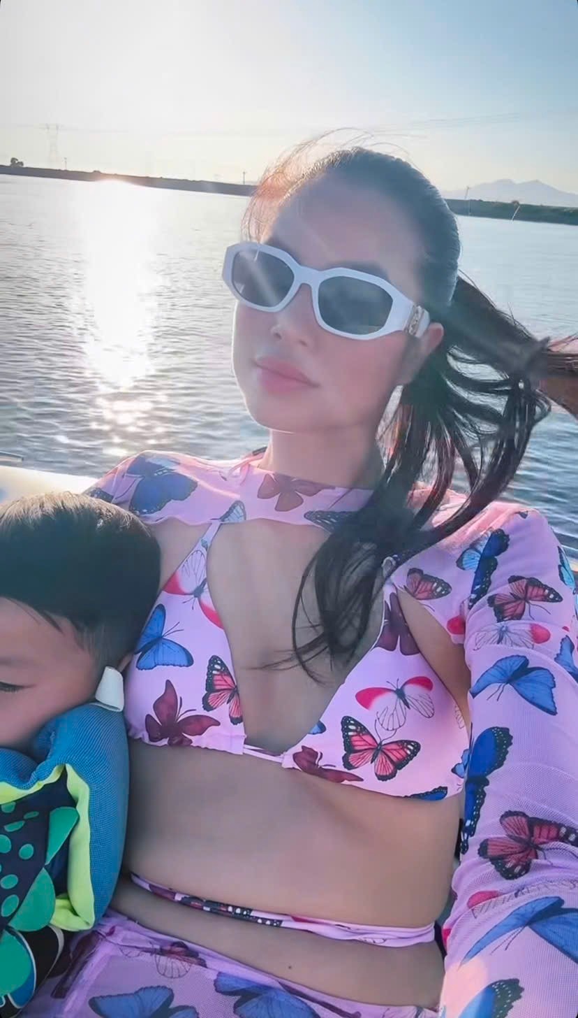 Diện bikini cut-out họa tiết con bướm, dù đã trải qua hai lần sinh nở, người đẹp vẫn sở hữu thân hình săn chắc đáng mơ ước, khiến nhiều người không khỏi ngưỡng mộ. Khoảnh khắc này nhanh chóng thu hút sự chú ý, bởi trước đó, Phạm Hương khá kín tiếng về cuộc sống riêng tư và hiếm khi đăng tải hình ảnh táo bạo.