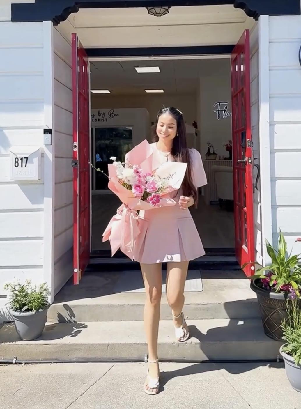 Đáng nói hơn, trong clip mới nhất trên trang Instagram của tiệm hoa, Phạm Hương lộ vóc dáng tròn trịa. Hoa hậu đình đám Vbiz diện chiếc váy rộng thùng thình, nhưng ở góc nghiêng có thể thấy được vòng 2 lùm lùm. Không chỉ thế, Phạm Hương còn đi dép bệt thay vì giày cao gót sành điệu như mọi khi. Trong những clip khoe tài cắm hoa được đăng tải tầm 1-3 tháng gần đây, Phạm Hương đặt bó hoa đằng trước để che dáng.