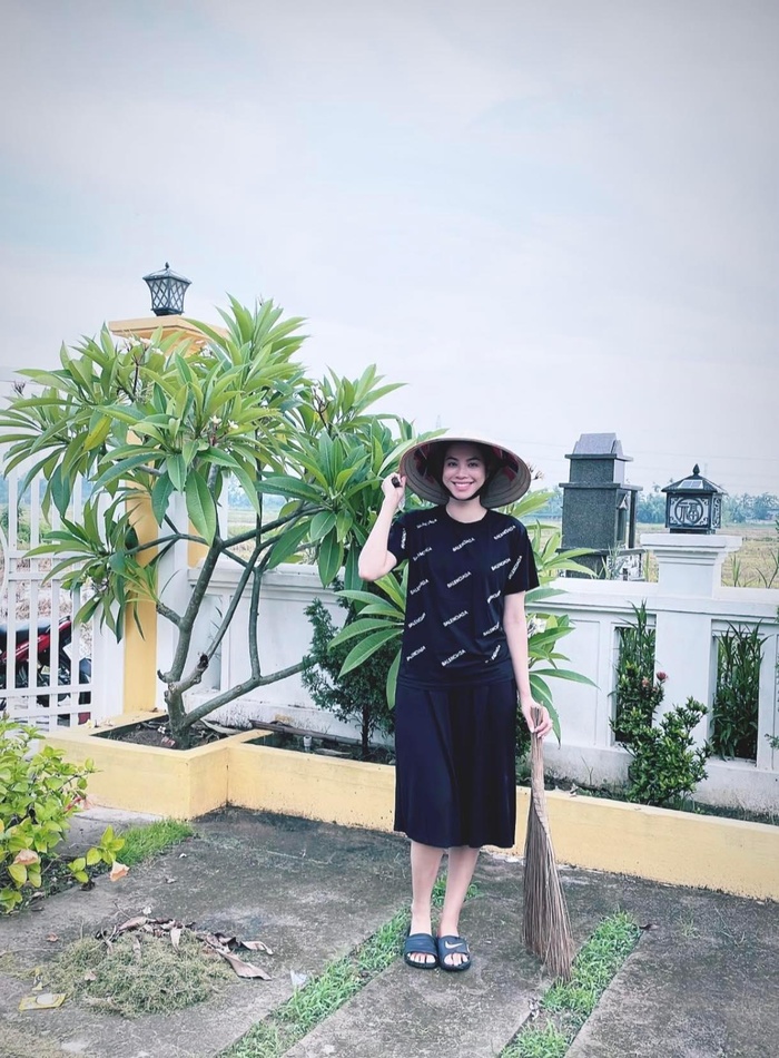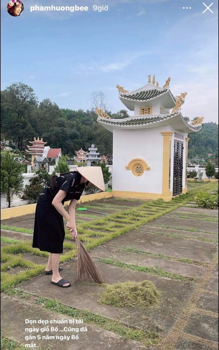 Trên Instagram, Phạm Hương đăng tải khoảnh khắc tất bật dọn dẹp phần mộ của bố để chuẩn bị ngày giỗ bố. Cô nghẹn ngào viết: "Dọn dẹp chuẩn bị tốt ngày giỗ bố. Cũng đã 5 năm ngày bố mất".