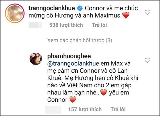 Theo đó, Lan Khuê viết dưới bài đăng của Phạm Hương: "Connor và mẹ chúc mừng cô Hương và anh Maximus". Mỹ nhân họ Phạm lời hồi đáp thân mật: "Em Max và mẹ cảm ơn Connor và cô Lan Khuê. Mẹ Hương hẹn cô Khuê khi nào về Việt Nam cho hai em gặp nhau làm bạn nhé. Yêu em Connor".
