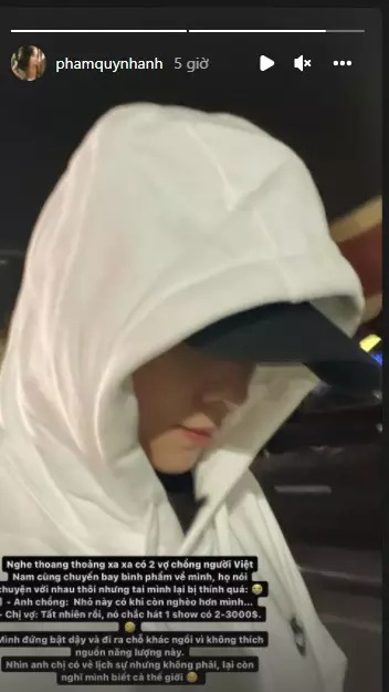 "Nghe thoang thoảng xa xa có 2 vợ chồng người Việt Nam cùng chuyến bay bình phẩm về mình. Họ nói: