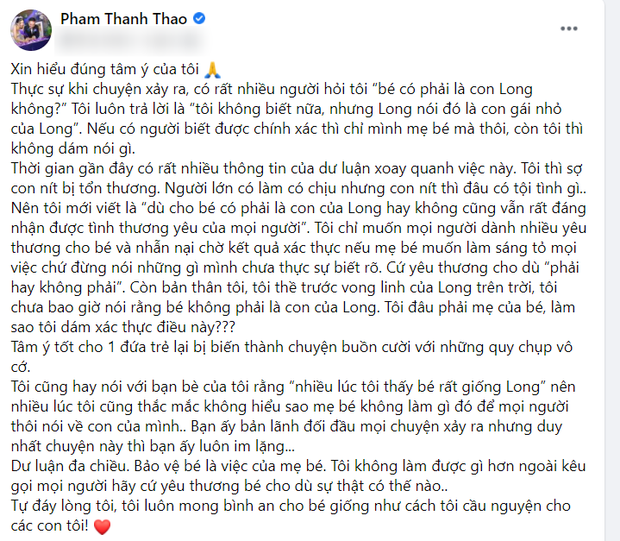 Mới đây, ca sĩ Phạm Thanh Thảo vừa khiến dân tình được một phen dậy sóng khi đăng tải dòng trạng thái nghi ngờ bé Helen không phải con ruột của NS Vân Quang Long. Theo đó, mỹ nhân họ Phạm chia sẻ đầy ẩn ý: "Cho dù bé có phải là con Long hay không thì cũng sẽ luôn đáng để được nhận tình thương từ mọi người, vì con nít là thiên thần", thậm chí cô còn tiết lộ đang chờ bằng chứng từ phía Linh Lan.