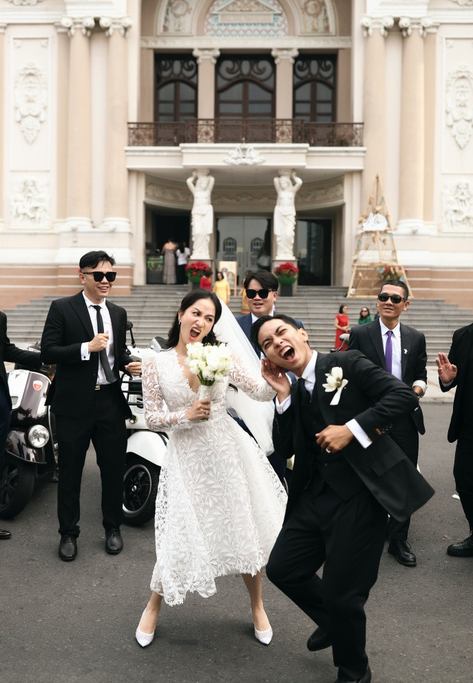 Cả hai cùng dàn phù rể tạo dáng chụp ảnh ở xung quanh khu vực Nhà hát Thành phố. Trong khoảnh khắc ý nghĩa, Khánh Thi và Phan Hiển trao nhau nụ hôn lãng mạn trước sự chứng kiến của mọi người.