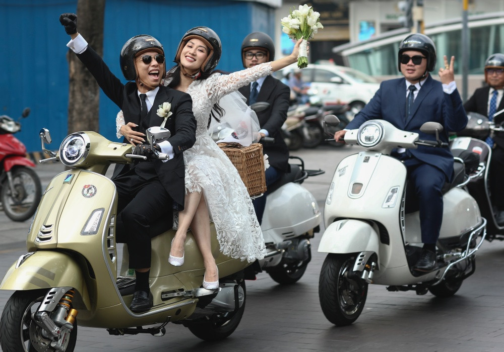 Sáng 22/12, Khánh Thi và Phan Hiển tổ chức buổi lễ đón dâu. Từ sáng sớm, chú rể cùng dàn mô tô đã có mặt tại nhà cô dâu để chuẩn bị "rước nàng về dinh".