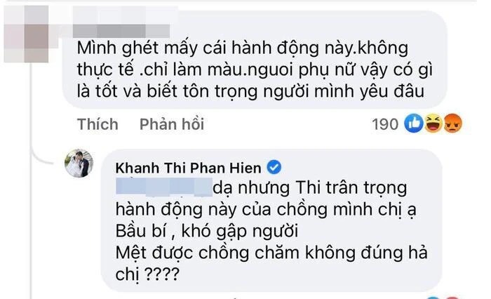 Trước đó có một khán giả đã để lại bình luận mỉa mai hành động của vợ chồng nữ kiện tướng: "Mình ghét mất cái hành động này, không thực tế, chỉ làm màu, người phụ nữ vậy có gì là tốt và biết tôn trọng người mình yêu đâu". Ngay sau đó Khánh Thi đã "đáp trả" cực "gắt":"Dạ nhưng Thi trân trọng hành động này của chồng mình chị ạ. Bầu bí, khó gập người. Mệt được chồng chăm không đúng hả chị?".