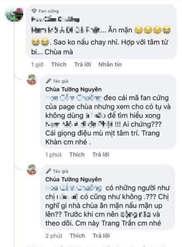 Theo đó, khi có một khán giả cho rằng việc chùa nấu đồ ăn mặn để phát cho các y bác sĩ là không hợp lý. Trang Khàn liền dùng tài khoản Chùa Tường Nguyên để trả lời với từ ngữ quá đà: "Đeo cái mã fan cứng của page chùa nhưng xem cho có và không dùng trí *** để tìm hiểu cho xong. Ai chứng? Cái giọng điệu mù mịt tâm trí. Trang Khàn comment nhé". Một bình luận vẫn chưa thấy đủ, cựu người mẫu tiếp tục chia sẻ thêm bình luận đáp trả với lời lẽ gay gắt và khẳng định: "Comment này Trang Trần comment nhé".