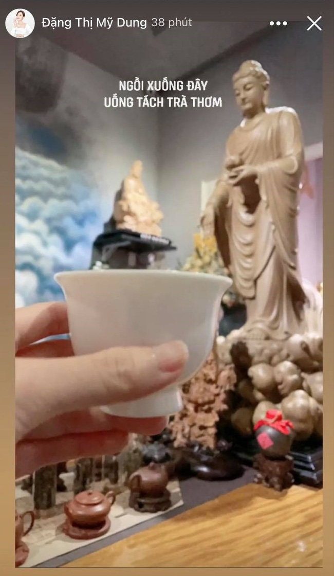 Giữa lúc dân tình đang xôn xao về đám cưới của hôn phu cũ, Midu lại có động thái không thể điềm tĩnh hơn. Nữ diễn viên cập nhật story đang ngồi thưởng trà, thư giãn. Cô viết: "Ngồi xuống đây uống tách trà thơm".