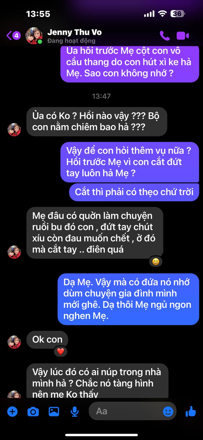 Khi nghe những tin này, nam nghệ sĩ đã nhắn tin cho mẹ hỏi: "Hồi trước mẹ cột con vô cầu thang do con hút xì ke hả mẹ. Sao con không nhớ?". Đáp lại câu hỏi của con trai, nghệ sĩ Cẩm Thu trả lời: "Ủa có không? Hồi nào vậy? Con nằm chiêm bao hả?".