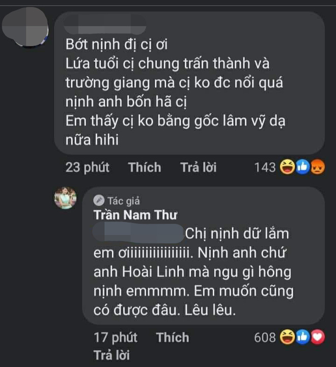 Đáp lại những lời bình luận đó, Nam Thư tỏ ra không bận tâm. Cô vẫn tiếp tục đăng tải hình ảnh và clip của Hoài Linh. Đồng thời đáp trả: "Chị nịnh dữ lắm em ơi. Nịnh anh nào chứ anh Hoài Linh ngu gì không nịnh em. Em muốn cũng có được đâu. Lêu lêu".