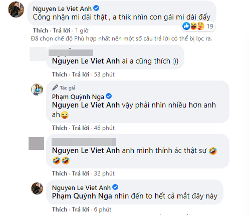 Mới đây, khi Quỳnh Nga đăng ảnh mới, khoe nhan sắc xinh xắn như búp bê, đặc biệt thể hiện sự thích thú với bộ lông mi của mình thì Việt Anh liền có động thái gây chú ý. Nam diễn viên là một trong những người để lại bình luận đầu tiên, tiện thể ẩn ý: "Công nhận mi dài thật. Anh thích nhìn con gái mi thật đấy". Ngay khi Quỳnh Nga đáp lại: "Vậy phải nhìn nhiều hơn anh ạ", Việt Anh cũng liền khẳng định: "Nhìn đến to cả mắt đây này".