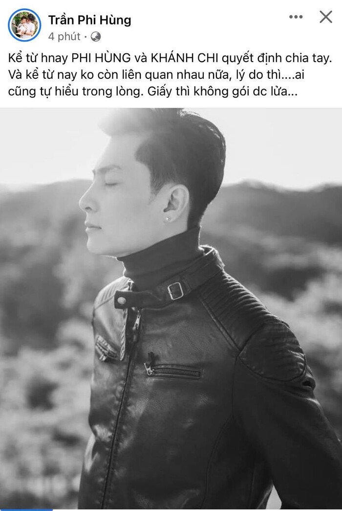 Mới đây, trên trang cá nhân của mình, ông xã của Lâm Khánh Chi - Trần Phi Hùng bất ngờ thông báo, anh và Lâm Khánh Chi đã chia tay nhau. Cụ thể chồng trẻ kém 8 tuổi của mỹ nhân chuyển giới viết: "Kể từ hôm nay, Phi Hùng và Khánh Chi quyết định chia tay. Và kể từ nay không còn liên quan nhau nữa, lý do thì ai cũng tự hiểu trong lòng. Giấy thì không gói được lửa".