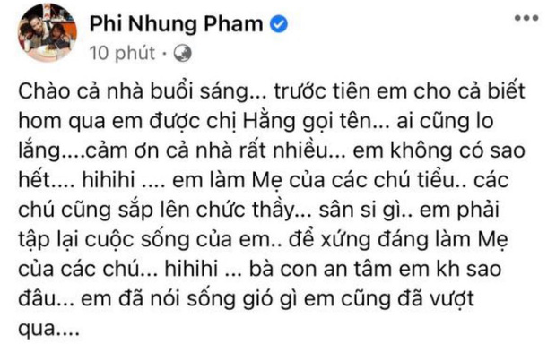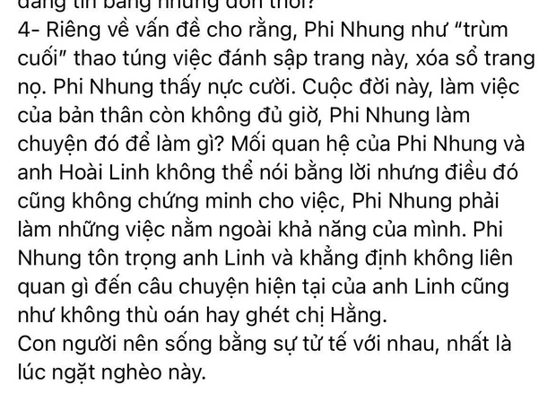 Trong tâm thư này, Phi Nhung cũng tiết lộ tâm trạng hiện tại và làm rõ mối quan hệ với NS Hoài Linh, đại gia Phương Hằng giữa loạt biến căng.