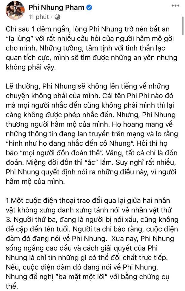 Trong tâm thư lên tiếng giải thích với cộng đồng mạng, Phi Nhung cho biết do sự việc này đang làm ảnh hưởng nghiêm trọng đến cuộc sống nên nữ ca sĩ nên phải giải thích. Nói về cách gọi "Phi Phi cô nương", Phi Nhung bức xúc: "Cái tên Phi Phi nào đó mà mọi người nhắc đến cũng không phải mình thì lại càng không được phép nhắc đến. Nhưng, Phi Nhung thương người hâm mộ của mình. Họ hoang mang về những thông tin đang lan truyền trên mạng và lo rằng 'hình như họ đang nhắc đến cô Nhung'. Hỏi thì họ bảo 'mọi người đồn đoán thế'. Vâng, tất cả chỉ là đồn đoán. Miệng đời đồn thì 'ác' lắm. Suy nghĩ rất nhiều, Phi Nhung quyết định nói ra những điều này, vì người hâm mộ của mình".