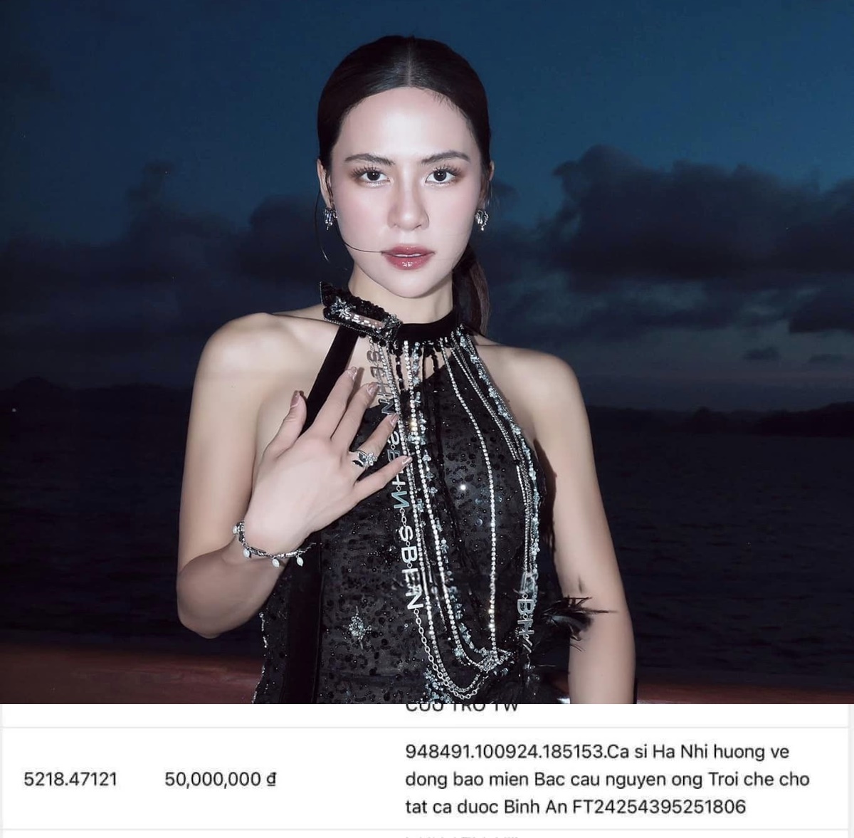 Ngoài ra, cư dân mạng sau đó cũng tìm ra sao kê chuyển khoản của Hà Nhi với nội dung: “Ca sĩ Hà Nhi hướng về đồng bào miền Bắc cầu nguyện ông trời che chở cho tất cả được Bình An” với số tiền là 50.000.000 đồng.