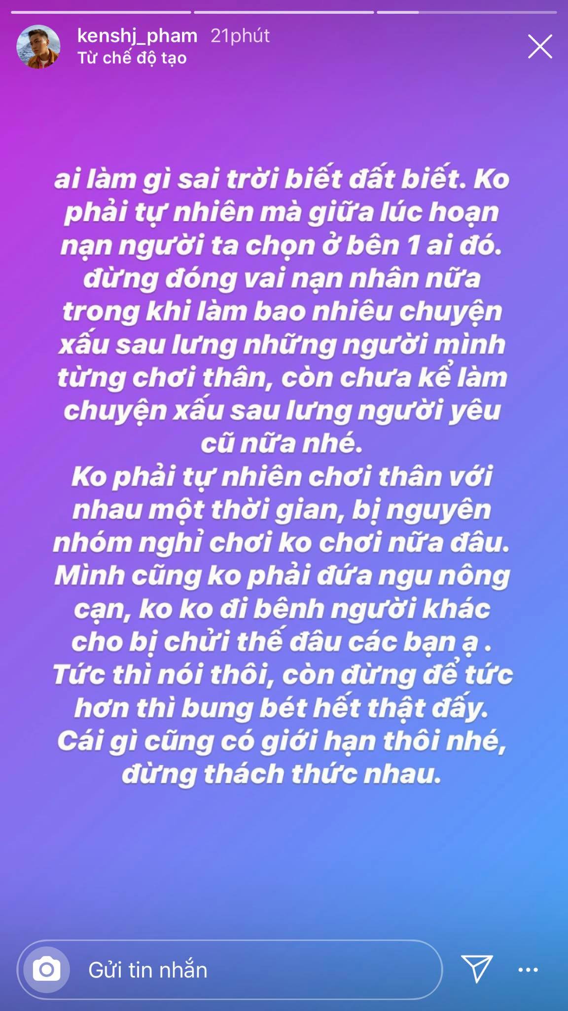 Chẳng bao lâu sau, anh chàng lại đăng story khá dài ám chỉ Quỳnh Anh Shyn chơi xấu bạn bè, làm điều có lỗi với người yêu cũ nên mới phải nhận "quả báo". Stylist này còn "nhắc nhở" Quỳnh Anh Shyn đừng đóng vai nạn nhân nữa và cũng đừng để mọi thứ vượt sức chịu đựng, nếu không sẽ cho "bung bét" tất cả.