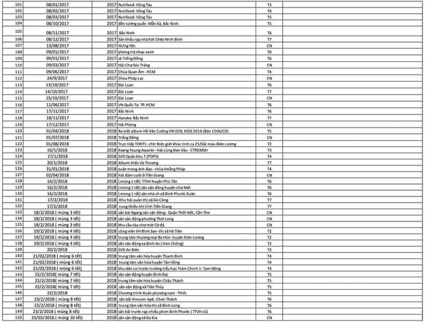 Tối 11/10, ngay sau khi ồn ào về cát-xê của Hồ Văn Cường tiếp tục bùng nổ, netizen đã chia sẻ mạnh mẽ 1 danh sách được cho là 310 sự kiện mà Quán quân Vietnam Idol Kids đã tham dự suốt 5 năm qua kể từ khi đăng quang. Sự kiện đầu tiên mà Hồ Văn Cường nhận trình diễn theo như danh sách là sân khấu song ca cùng nữ ca sĩ Văn Mai Hương tại chương trình Thần Tượng Âm Nhạc vào ngày 26/7/2016. Đêm diễn gần đây nhất của Hồ Văn Cường là vào ngày 5/2/2021 tại Coffee Vườn An Nhiên, quận 12 (đây cũng là quán cafe của nữ ca sĩ Phi Nhung đầu tư lúc sinh thời).