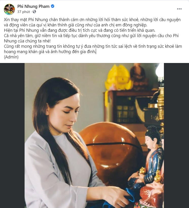 Mới đây, trang fanpage của Phi Nhung bất ngờ đăng tải dòng thông báo về tình hình sức khỏe của nữ ca sĩ. Người quản lý fanpage thay mặt Phi Nhung gửi lời cảm ơn đến sự quan tâm của khán giả, đồng thời bác bỏ những tin đồn thất thiệt về bệnh tình của cô.