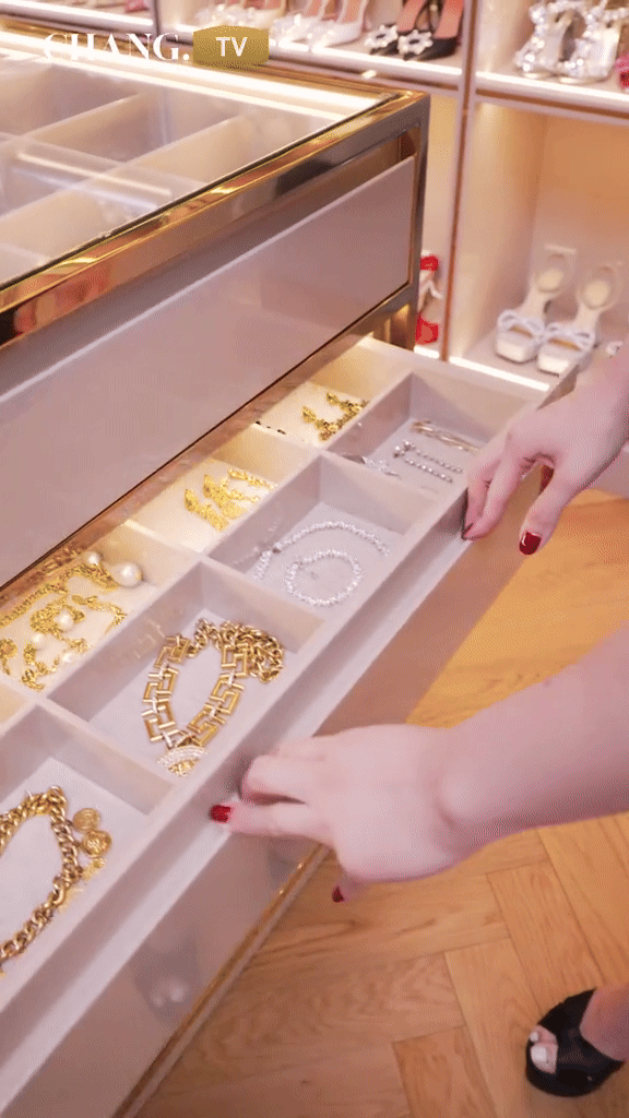 Bên cạnh đó ở giữa phòng, ông xã Chi Bảo thiết kế cho cô một chiếc tủ đựng trang sức, phụ kiện hoành tráng không kém. Tủ được thiết kế mặt kính với nhiều ngăn đựng đồ, chia để nữ trang như vòng tay, vòng cổ, khuyên tai,... Đặc biệt hơn trong dịp Tết vừa rồi, Thuỳ Chang còn unbox thêm một món đồ hiệu cực xịn để bày trong phòng thay đồ.