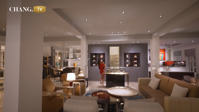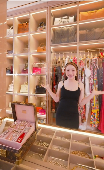 Tổng thể phòng thay đồ được lựa chọn theo tone vàng ấm cúng, sang trọng. Ánh sáng và gương được lắp đặt ở khắp nơi để trông căn phòng thêm phần lung linh hơn. Nhìn vào phòng thay đồ này, netizen phải cảm thán về độ giàu có của vợ chồng Chi Bảo. Thậm chí, nhiều người còn cho rằng, chỉ tính riêng tiền túi xách hay những món đồ mà Thuỳ Chang sở hữu có thể “sương sương” cũng đủ mua một căn nhà.