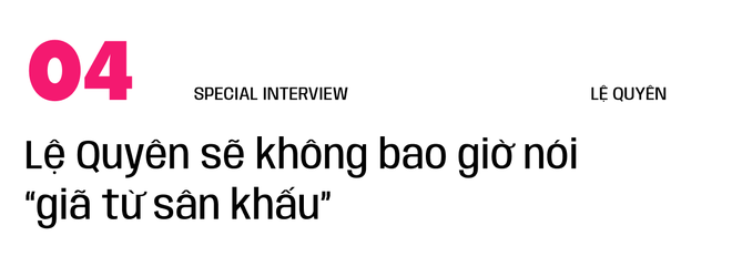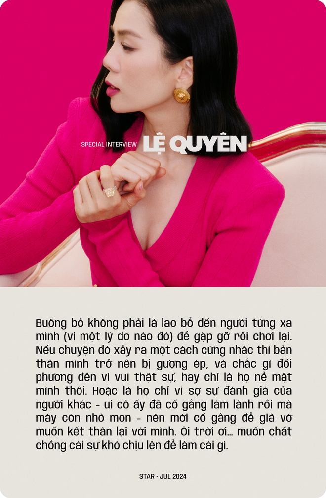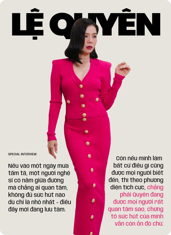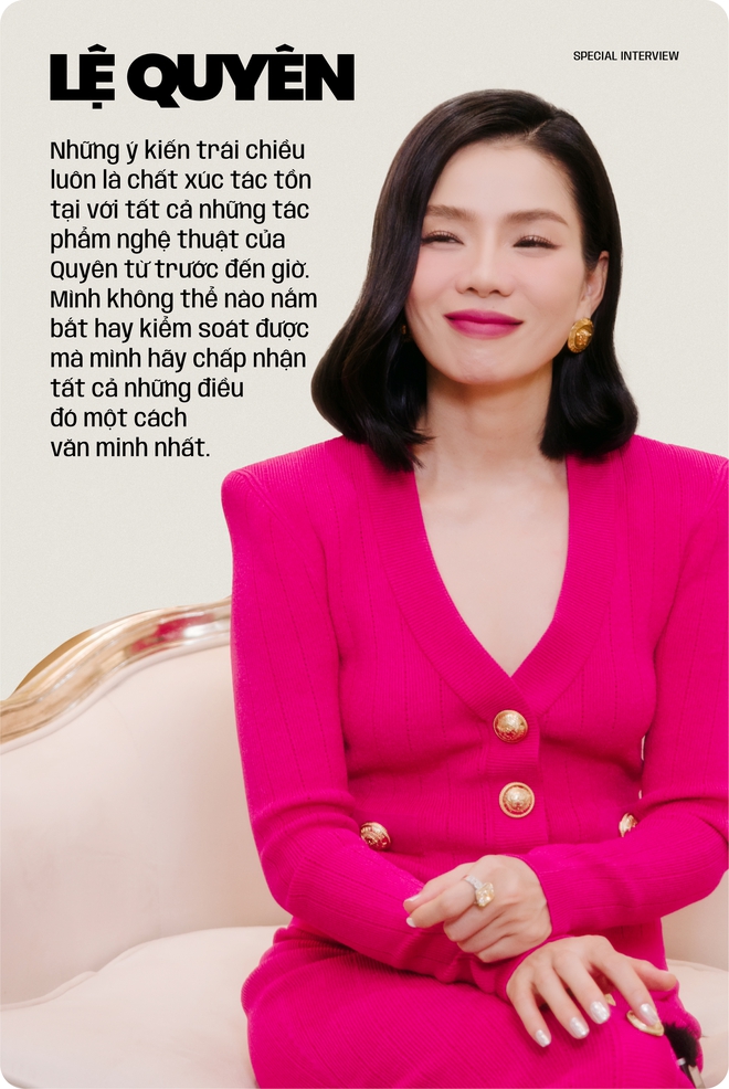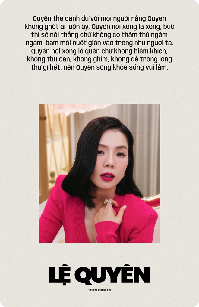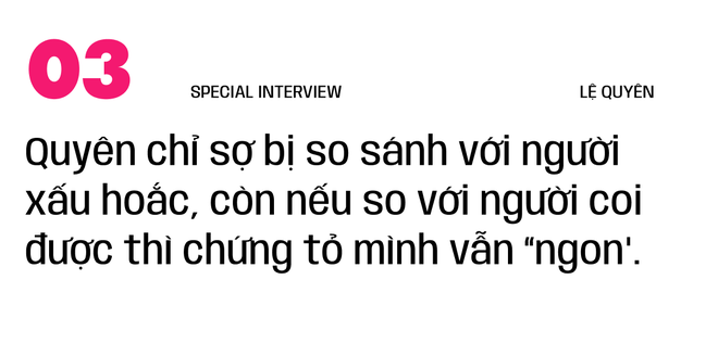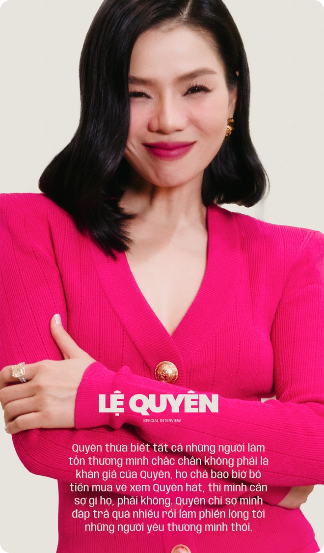 Nhiều người hay thắc mắc với vị trí của Lệ Quyên, tại sao cô phải đôi co với từng người trên mạng? Lệ Quyên trả lời rất đơn giản - vì cô muốn bảo vệ những người mình yêu thương. Trong buổi trò chuyện cùng chúng tôi, Lệ Quyên lần đầu trải lòng về tất cả những góc nhỏ tạo nên cuộc sống của nữ ca sĩ, đó là âm nhạc, tình yêu, gia đình - hết thảy được Lệ Quyên nói bằng chính cá tính, sự bộc trực và sâu sắc.