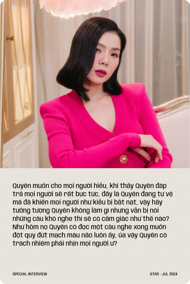 Còn chuyện Quyên giữ chừng mực và dừng lại, gần như không đối đáp nữa là vì thứ nhất mình không có thời gian, thứ hai mình không chấp và thứ ba là vì những người Quyên yêu thương, mình sợ ảnh hưởng đến cảm xúc của họ, chứ Quyên có sợ cái gì đâu. Quyên thừa biết tất cả những người làm tổn thương mình chắc chắn không phải là khán giả của Quyên, họ chả bao biờ bỏ tiền mua vé xem Quyên hát, thì mình cần sợ gì họ, phải không. Quyên chỉ sợ mình đáp trả quá nhiều rồi làm phiền lòng tới những người yêu thương mình thôi.