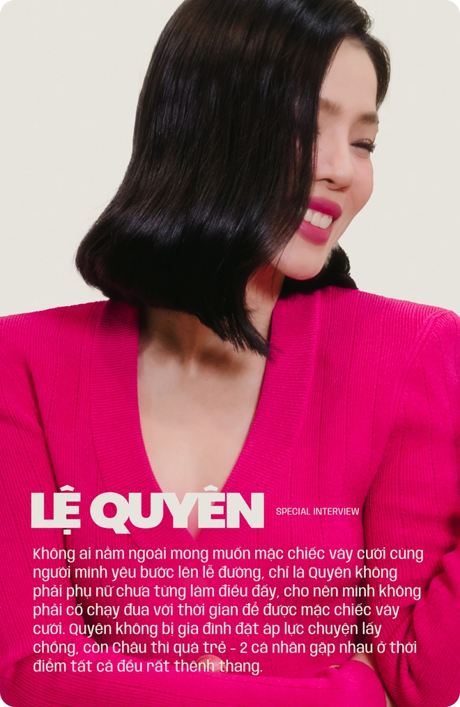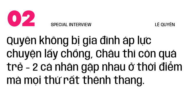 Quyên không bị gia đình đặt áp lực chuyện lấy chồng vì Quyên đã từng, còn Châu thì quá trẻ, 2 cá nhân gặp nhau ở thời điểm tất cả đều rất thênh thang. Nhưng nếu như mọi thứ tốt đẹp theo thời gian, ngày càng gắn kết và cần nhau hơn thì đích đến cuối cùng nó phải là chuyện đấy. Quyên cũng không biết là 1 năm, 2 năm hay 5 năm mình sẽ mặc váy cưới, hoàn toàn có thời điểm chính xác. Nhưng cũng có thể như này thôi cũng đủ rồi, miễn là sống vui vẻ bên nhau vì đám cưới sẽ chỉ là hình thức nếu như 2 người không hạnh phúc và không cần nhau.