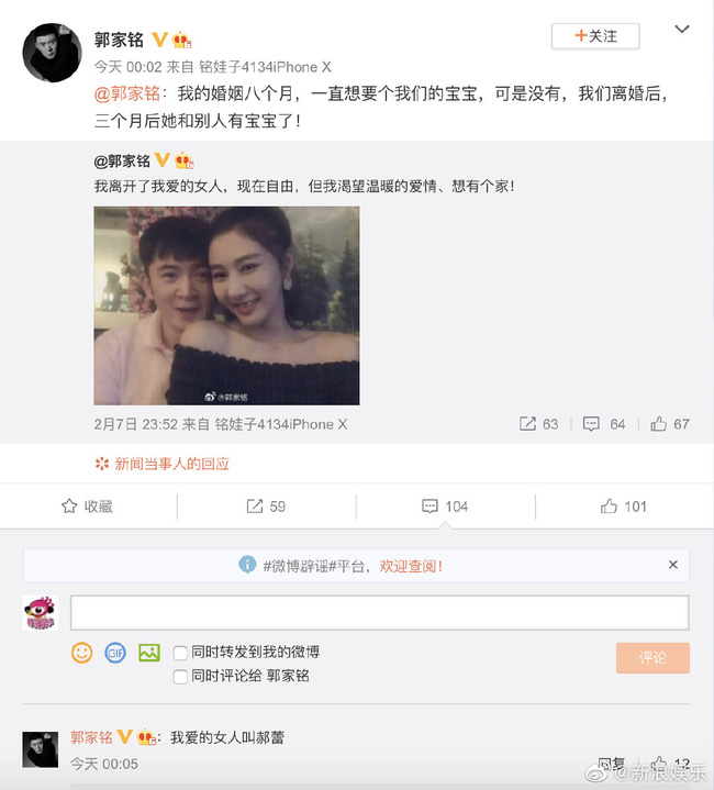 Theo Quách Gia Minh, anh cùng Hác Lôi đã ly hôn. Tuy nhiên, anh cũng tiết lộ việc, bản thân cùng Hác Lôi mới ly hôn được 3 tháng nhưng cô đã có con với người khác. "Tôi kết hôn được 8 tháng, vẫn mong có 1 đứa bé, nhưng không có. Ly hôn xong, 3 tháng sau cô ấy có con với người khác" và ở dưới bình luận nam diễn viên còn bày tỏ "Người phụ nữ tôi yêu gọi là Hác Lôi".
