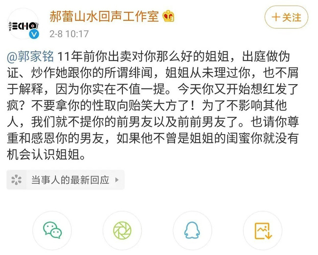 Ngay sau đó, phía studio văn phòng làm việc của Hác Lôi cũng lên tiếng đáp trả cực gắt khi tố Quách Gia Minh là người đồng tính. "Quách Gia Minh, 11 năm trước anh bán đứng chị ấy, chị ấy đối xử với anh tốt như vậy, anh ra tòa làm chứng giả, lăng xê cái gọi là tai tiếng giữa anh và chị ấy, chị ấy cũng chưa hề bắt bẻ anh, cũng lười đi giải thích, bởi vì anh chẳng đáng để nhắc tới. Hôm nay anh lại bắt đầu đi điên đảo? Không cần phải lấy xu hướng giới tính của anh ra làm trò cười cho thiên hạ!".