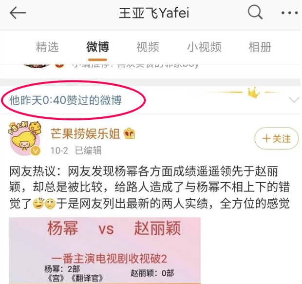 Cụ thể, Vương Á Phi - nhân viên trang điểm thuộc ekip nữ thần họ Triệu bị phát hiện ấn like bài viết của blogger so sánh thành tích đóng phim của mỹ nhân họ Dương và Triệu Lệ Dĩnh. Nội dung của bài viết này có những con số khẳng định, bà xã Phùng Thiệu Phong thua kém mọi mặt so với Dương Mịch. Ngôi sao họ Dương có nhiều phim đạt rating cao, từ Cung Toả Tâm Ngọc, Người Phiên Dịch, Tam Sinh Tam Thế,... trong khi đó, số phim đạt thành tích ấn tượng của Triệu Lệ Dĩnh lại thấp hơn hẳn.