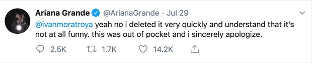 Ngay sau đó, cả Ariana Grande và người bạn đều bị ném đá thậm tệ. Dân tình đều cho rằng câu đùa của Ariana có phần xúc phạm người đã khuất. Chính Ariana cũng đã nhanh chóng nhận ra sự thiếu tinh tế của bản thân, lập tức xoá bình luận kèm theo lời xin lỗi trên trang cá nhân Twitter: "Tôi đã xoá bình luận rất nhanh và hiểu rằng nó chẳng hài hước tí nào. Tôi đã phát ngôn quá giới hạn và thật lòng cảm thấy hối lỗi".