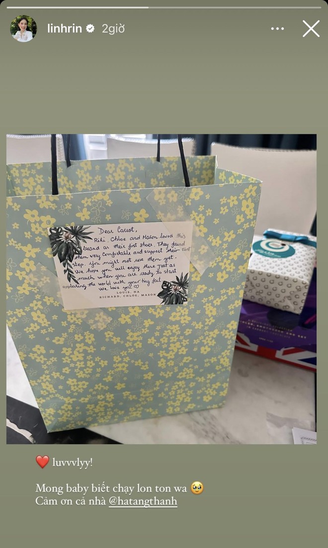 Để đáp lại tình cảm của chị dâu, Linh Rin bày tỏ sự hào hứng, mong chờ đến lúc con gái tập đi để được sử dụng món quà này. Sau đó, Tăng Thanh Hà cũng đăng tải lại bài viết cảm ơn của Linh Rin kèm biểu tượng 1 trái tim. Hành động này cũng chứng minh mối quan hệ của 2 cô con dâu nhà tỷ phú không quá căng thẳng như những gì cư dân mạng đồn đoán suốt thời gian vừa qua.