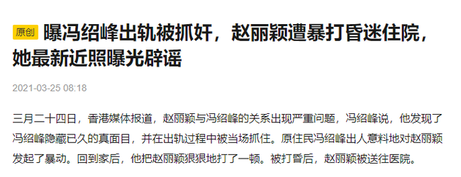 Vào ngày 24/3, giới truyền thông Hong Kong đưa tin cho biết mối quan hệ của Triệu Lệ Dĩnh và Phùng Thiệu Phong đang gặp vấn đề rất nghiêm trọng. Phùng Thiệu Phong bị "bắt gian tại trận" vì ngoại tình, không chỉ vậy tài tử Cung tỏa tâm ngọc còn bạo hành Triệu Lệ Dĩnh dã man đến mức bất tỉnh phải vào viện cấp cứu, hiện tại cô vẫn đang hôn mê chưa tỉnh.