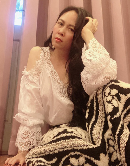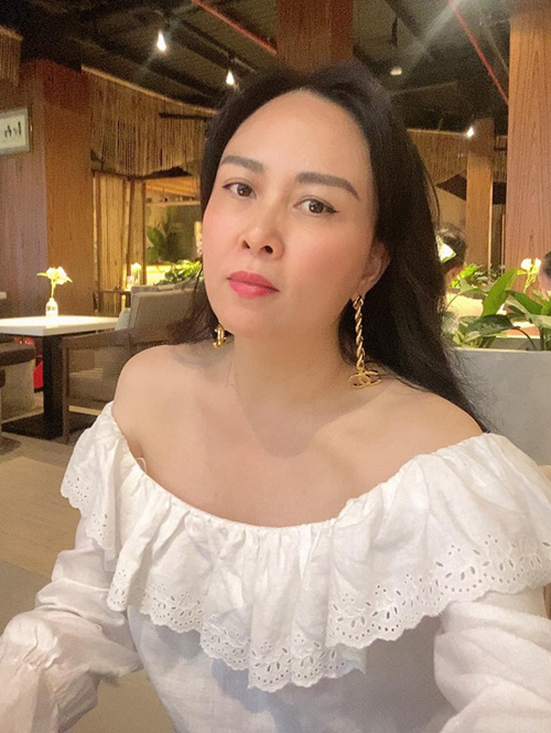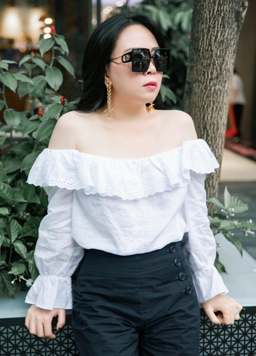 Gần đây bà xã của Quách Ngọc Ngoan chuộng váy áo hở vai. Cô rất tự tin với làn da trắng mịn tự nhiên, dù đã qua tuổi 40.