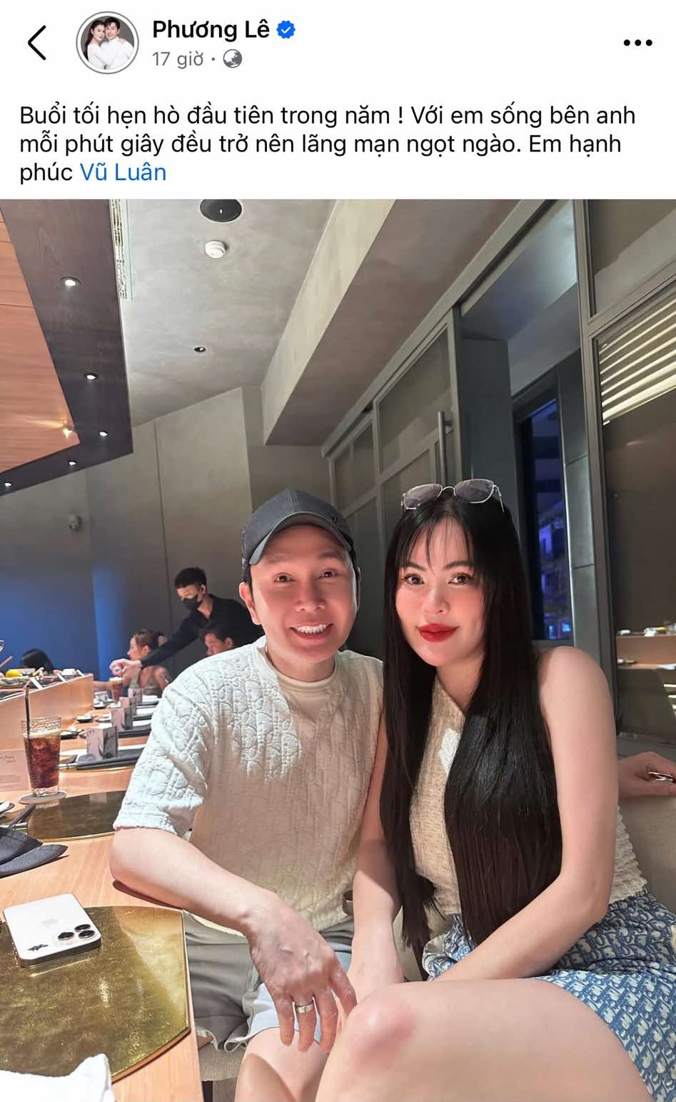 Mới đây, Phương Lê - vợ NSƯT Vũ Luân đã đăng tải lên trang cá nhân hình ảnh hẹn hò cùng dòng chú thích ngọt ngào: "Buổi tối hẹn hò đầu tiên trong năm! Với em sống bên anh mỗi phút giây đều trở nên lãng mạn ngọt ngào. Em hạnh phúc". Đáp lại, Vũ Luân bày tỏ tình cảm với vợ: "Sẽ mãi bên em và yêu em thật nhiều. Vợ yêu".
