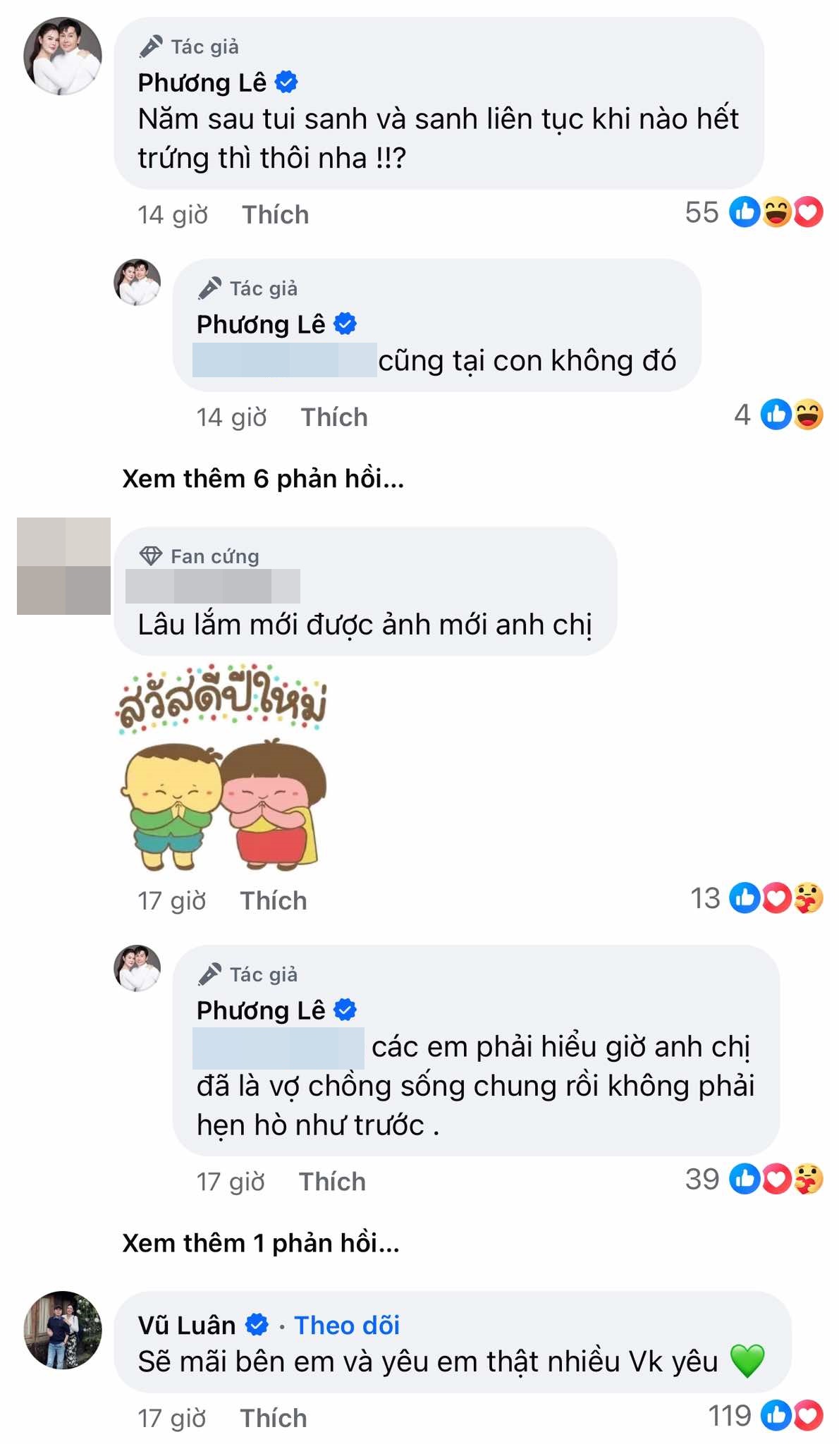 Đáng chú ý, Phương Lê còn có tuyên bố rất táo bạo về việc sinh con cho Vũ Luân. Cô viết: "Năm sau tôi sinh và sinh liên tục khi nào hết trứng thì thôi nha!". Thời gian qua, Phương Lê liên tục bị đặt câu hỏi về việc sinh con. Cô từng thừa nhận là khá áp lực về điều này.