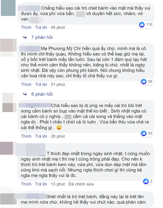 Cụ thể, Phương Mỹ Chi cùng bạn bè và anh chị em đã mang bánh sinh nhật tới để tạo bất ngờ. Tuy nhiên ngay sau đó, tất cả đã kẹp người mẹ Phương Mỹ Chi lại và trét nguyên chiếc bánh kem lên mặt. Không những vậy, sau khi mẹ Phương Mỹ Chi thay đồ và rửa mặt sạch sẽ, nữ ca sĩ cùng mọi người trong nhà còn quỳ lạy để hát mừng sinh nhật. Hiện trên một số diễn đàn mạng xã hội, vô số bình luận đều cho rằng cách mừng sinh nhật này là quá đà đối với người lớn. Không chỉ vậy, việc bôi trét bánh kem cũng gây lãng phí, mất vệ sinh. Mặc dù nhiều người nhận định đây chỉ là hành động mang tính đùa giỡn, góp vui cho buổi tiệc nhưng đa phần dân mạng vẫn dành nhiều bình luận trái chiều cho Phương Mỹ Chi cùng các chị em trong gia đình.