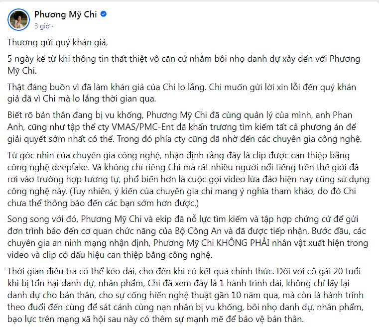"Từ góc nhìn của chuyên gia công nghệ, nhận định rằng đây là clip được can thiệp bằng công nghệ deepfake. Và không chỉ riêng Chi mà rất nhiều người nổi tiếng trên thế giới đã rơi vào trường hợp tương tự, phổ biến hơn là cuộc gọi video lừa đảo hiện nay cũng sử dụng công nghệ này. Tuy nhiên, ý kiến của chuyên gia chỉ mang ý nghĩa tham khảo, do đó Chi chưa thể thông báo đến các bạn sớm hơn được" Phương Mỹ Chi chia sẻ.