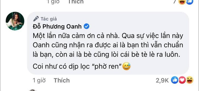 Cụ thể bên dưới một bài đăng, diễn viên Phương Oanh để lại bình luận rằng: "Một lần nữa cảm ơn cả nhà. Qua sự việc lần này Oanh cũng nhận ra được ai là bận thì vẫn chuẩn là bạn, còn ai là bè cũng lòi cái bè tè le ra luôn. Coi như có dịp lọc 'phờ ren'".
