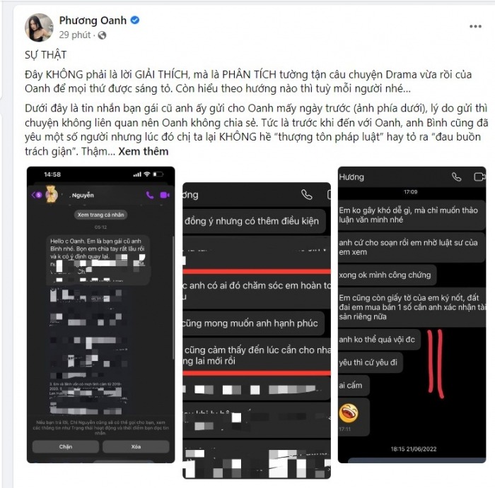 Cụ thể, Phương Oanh cho biết trước khi yêu mình, Shark Bình đã từng yêu 1 số người (đi kèm hình ảnh tin nhắn của 1 cô bạn gái cũ) và khẳng định ở thời điểm đó, bà Đào Lan Hương – vợ Shark Bình không hề can dự, lên tiếng về ’sự thượng tôn pháp luật’ và bà cũng không hề tỏ ra đau buồn.