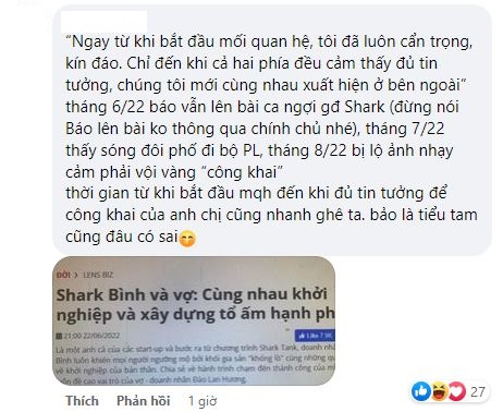 Tuy nhiên ở dưới phần bình luận, một khán giả đã để lại hình ảnh một bài viết và đưa ra quan điểm chứng minh Phương Oanh là "tiểu tam": "Ngay từ khi bắt đầu mối quan hệ, tôi đã luôn cẩn trọng, kín đáo. Chỉ đến khi cả hai phía đều cảm thấy đủ tin tưởng, chúng tôi mới cùng nhau xuất hiện ở bên ngoài”. Tháng 6 năm 2022 báo vẫn lên bài ca ngợi gia đình Shark Bình (đừng nói báo lên bài không thông qua chính chủ nhé), tháng 7 năm 2022 thấy sóng đôi phố đi bộ, tháng 8 năm 2022 bị lộ ảnh nhạy cảm phải vội vàng “công khai”. Thời gian từ khi bắt đầu mối quan hệ đến khi đủ tin tưởng để công khai của anh chị cũng nhanh ghê ta, bảo là tiểu tam cũng đâu có sai".