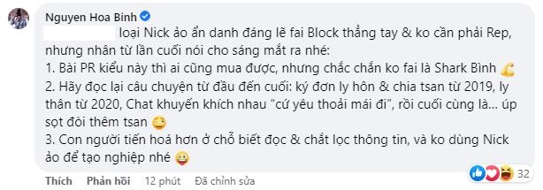 Sau khi thấy Phương Oanh nhận về bình luận tiêu cực, Shark Bình ngay lập tức đáp trả và vạch ra từng ý một cách rõ ràng: "Loại tài khoản ẩn danh đáng lẽ phải chặn thẳng tay và không cần phải trả lời, nhưng nhân từ lần cuối nói cho sáng mắt ra nhé: 1. Bài PR kiểu này thì ai cũng mua được, nhưng chắc chắn không là Shark Bình; 2. Hãy đọc lại câu chuyện từ đầu đến cuối: ký đơn ly hôn và chia tài sản từ 2019, ly thân từ 2020. Khuyến khích nhau “cứ yêu thoải mái đi”, rồi cuối cùng à úp sọt đòi thêm tài sản; 3. Con người tiến hoá hơn ở chỗ biết đọc và chắt lọc thông tin, và không dùng tài khoản ảo để tạo nghiệp nhé".